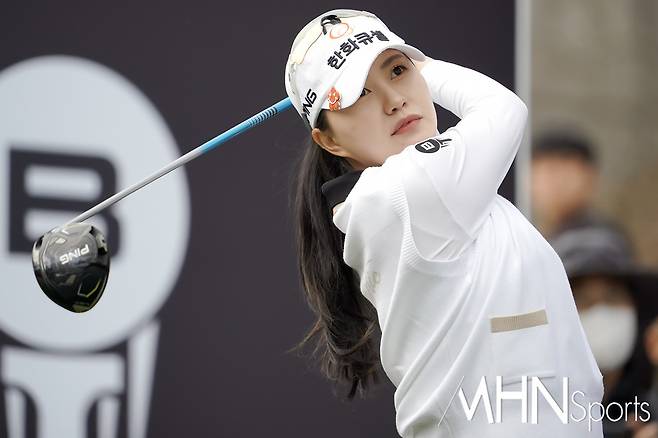 (MHN스포츠 여수, 박태성 기자) 18일 전남 여수시에 위치한 디오션컨트리클럽 이스트-웨스트 코스(파72ㅣ6,110야드)에서 KLPGA투어 최고 골프구단을 가리는 '디오션 비치콘도 발리스틱 컵 골프구단 대항전'(총상금 6천만원ㅣ우승상금 3천만원) 변형포섬 2라운드가 열린가운데, 한화큐셀 허다빈이 1번홀 티샷을 날리고 있다.