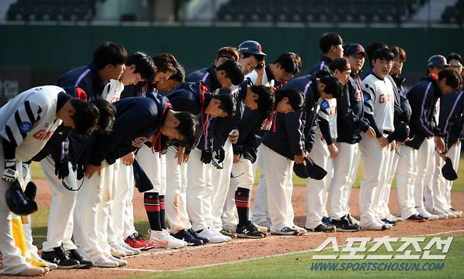 2023 KBO리그 시범경기 롯데 자이언츠와 LG 트윈스의 경기가 18일 부산 사직구장에서 열렸다. 경기에서 패한 롯데 선수들이 아수워하고 있다. 부산=박재만 기자 pjm@sportschosun.com/2023.03.18/