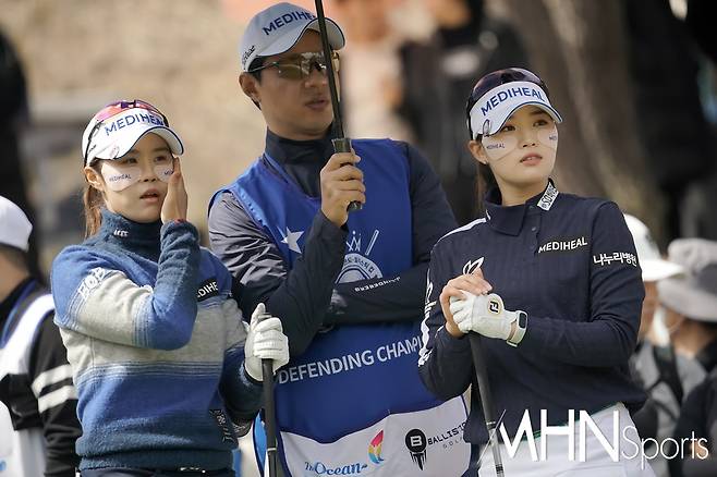 (MHN스포츠 여수, 박태성 기자) 18일 전남 여수시에 위치한 디오션컨트리클럽 이스트-웨스트 코스(파72ㅣ6,110야드)에서 KLPGA투어 최고 골프구단을 가리는 '디오션 비치콘도 발리스틱 컵 골프구단 대항전'(총상금 6천만원ㅣ우승상금 3천만원) 변형포섬 2라운드가 열린가운데, 메디힐 최혜용, 안지현이 1번홀 페어웨이를 바라보고 있다.