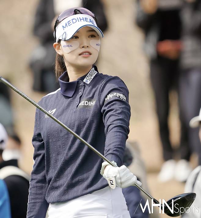 (MHN스포츠 여수, 박태성 기자) 18일 전남 여수시에 위치한 디오션컨트리클럽 이스트-웨스트 코스(파72ㅣ6,110야드)에서 KLPGA투어 최고 골프구단을 가리는 '디오션 비치콘도 발리스틱 컵 골프구단 대항전'(총상금 6천만원ㅣ우승상금 3천만원) 변형포섬 2라운드가 열린가운데, 메디힐 안지현이 1번홀 티샷을 준비하고 있다.
