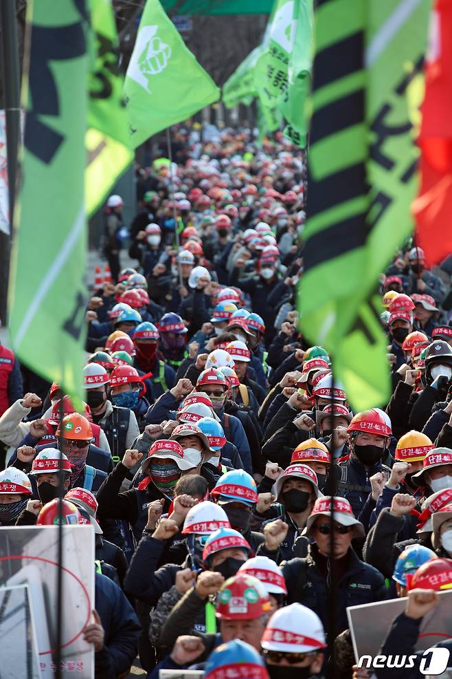 (서울=뉴스1) 박정호 기자 = 전국건설노동조합 조합원 등이 18일 오후 서울 종로구 정부서울청사 옆에서 열린 건설현장 불법시공 부실공사 실태고발 및 건설노조 탄압분쇄 수도권 건설노동자 결의대회에서 구호를 외치고 있다. 2023.3.18/뉴스1