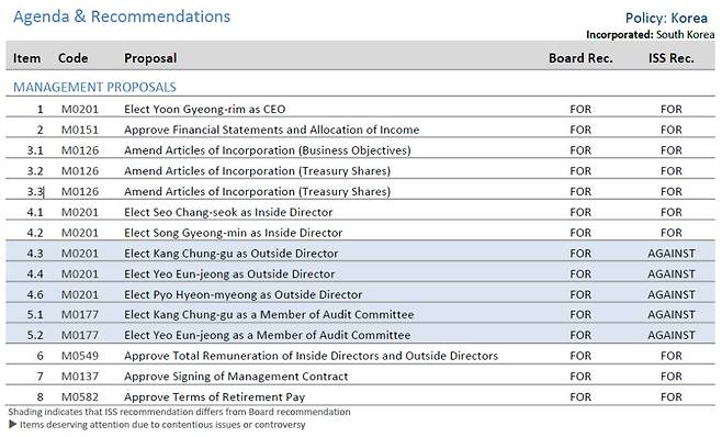 ISS는 이사 보수, 회계보고서 통과 등 나머지 안건에 대해서는 모두 찬성을 표시했다. ISS는 세계최대 의결권 자문기관이다. 외국인 주주의 주주총회 투표에서 영향력을 행사할 것으로 전망된다.