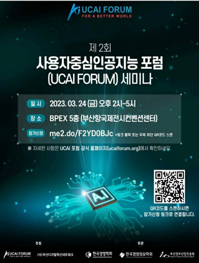 앞서 지난 지난 1월 30일 서울 여의도에서 창립 세미나가 열렸고 이번이 두번째 행사다. 행사는 UCAI포럼과 사단법인 부산디지털 혁신 네트워크가 공동 개최하고 한국경영학회와 한국경영정보학회, 부산정보산업진흥원이 공동 주관한다. 금융, 유통, 의료 등 산업에 이미 활용되고 있는 사용자중심 인공지능 접근 방법이 소개되고 세계 각국 동향도 살핀다.