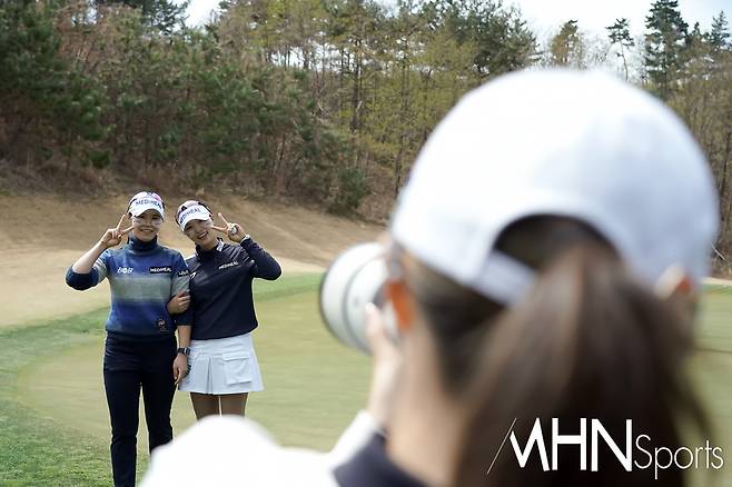 (MHN스포츠 여수, 박태성 기자) 18일 전남 여수시에 위치한 디오션컨트리클럽 이스트-웨스트 코스(파72ㅣ6,110야드)에서 KLPGA투어 최고 골프구단을 가리는 '디오션 비치콘도 발리스틱 컵 골프구단 대항전'(총상금 6천만원ㅣ우승상금 3천만원) 변형포섬 2라운드가 열린가운데, 메디힐 김재희가 취재진의 카메라로 최혜용과 안지현을 촬영하고 있다.