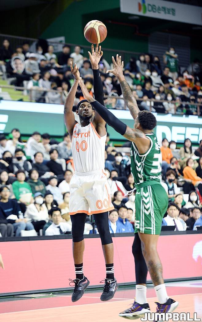 DB는 18일 원주종합체육관에서 열린 2022-2023 SKT 에이닷 프로농구 정규리그 홈경기에서 19점을 올린 디존 데이비스를 앞세워 디드릭 로슨, 이정현이 빠진 고양 캐롯을 68–57로 꺾었다.