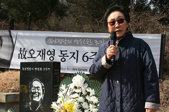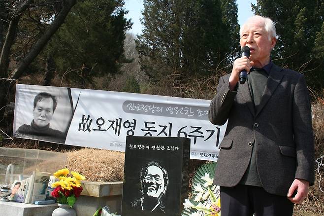| ▲ 故 오재영 6주기의 권영길 故 오재영 6주기 추모식에 참석한 권영길 이사장은 "오재영 동지를 비롯한 모든 동지가 염원했던 진보 정당의 꽃이 활짝 피기를 기대한다”고 말했다. |