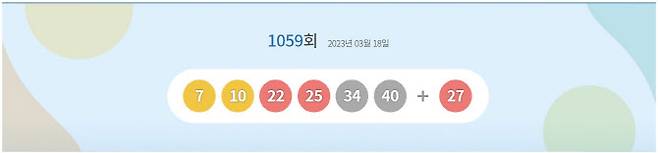 [이데일리 김국배 기자] 로또복권 운영사 동행복권은 18일 제1059회 로또복권 추첨에서 1등 당첨번호로 ‘7, 10, 22, 25, 34, 40’이 뽑혔다고 밝혔다. 2등 보너스 번호는 ‘27’이다.