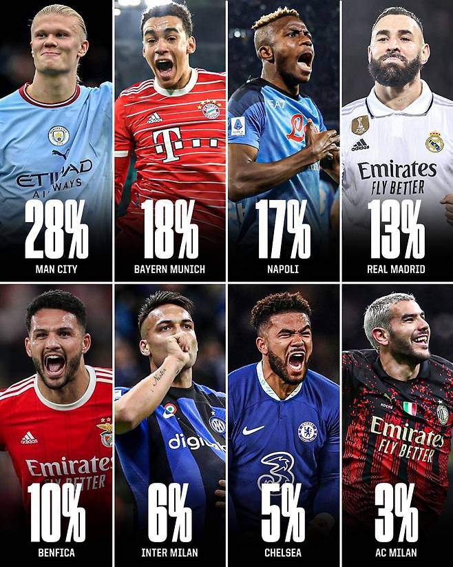 1위는 맨체스터 시티가 28%로 가장 높았다. 맨시티는 우승을 이루지 못했지만, 경험이 풍부한 펩 과르디올라 감독과 괴물 공격수 엘링 홀란의 존재가 가장 커 보였다. 단골 우승 후보 바이에른 뮌헨은 18%로 2위, 디펜딩 챔피언 레알 마드리드는 13%로 4위를 기록했다.