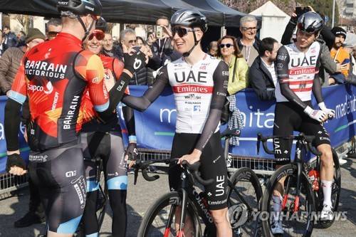 epa10529858 Slovenian Tadej Pogacar of the team UAE Team Emirates prepares for the start of the 114th edition of the Milan-San Remo cycling race in Abbiategrasso, Italy, 18 March 2023. With a distance of 298 km, the 'Spring classic' is the longest professional one-day race in modern cycling. EPA/ROBERTO BETTINI