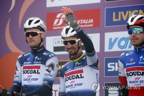 epa10529856 French Julian Alaphilippe of the team Soudal - Quick Step prepares for the start of the 114th edition of the Milan-San Remo cycling race in Abbiategrasso, Italy, 18 March 2023. With a distance of 298 km, the 'Spring classic' is the longest professional one-day race in modern cycling. EPA/ROBERTO BETTINI