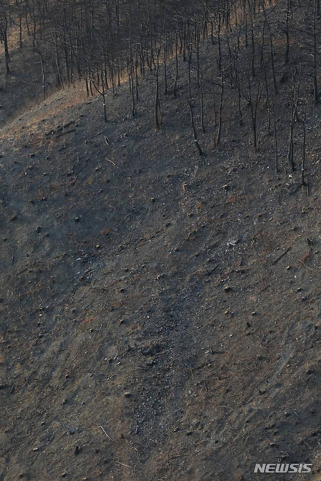 [동해=뉴시스] 김경목 기자 = 동해산불이 발생한 지 1년이 된 18일 오후 강원 동해시 오학산 산불 현장은 벌채로 잘려진 나무들의 밑동과 검게 탄 죽은 나무들로 흉물스럽다. 2023.03.18. photo31@newsis.com