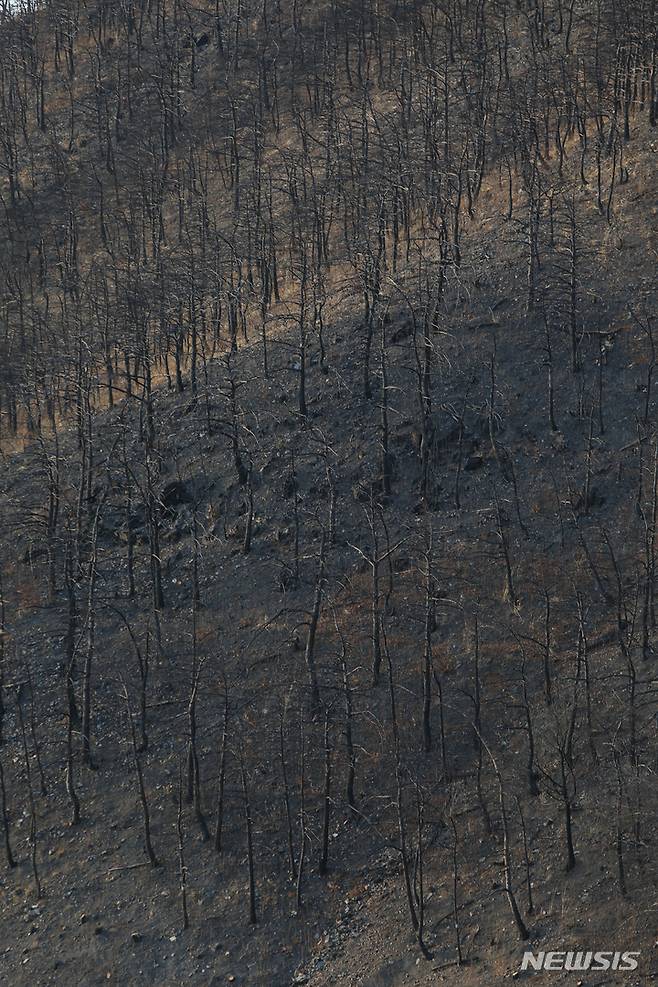 [동해=뉴시스] 김경목 기자 = 동해산불이 발생한 지 1년이 된 18일 오후 강원 동해시 오학산 산불 현장은 벌채로 잘려진 나무들의 밑동과 검게 탄 죽은 나무들로 흉물스럽다. 2023.03.18. photo31@newsis.com