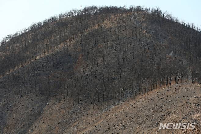 [동해=뉴시스] 김경목 기자 = 동해산불이 발생한 지 1년이 된 18일 오후 강원 동해시 오학산 산불 현장은 벌채로 잘려진 나무들의 밑동과 검게 탄 죽은 나무들로 흉물스럽다. 2023.03.18. photo31@newsis.com