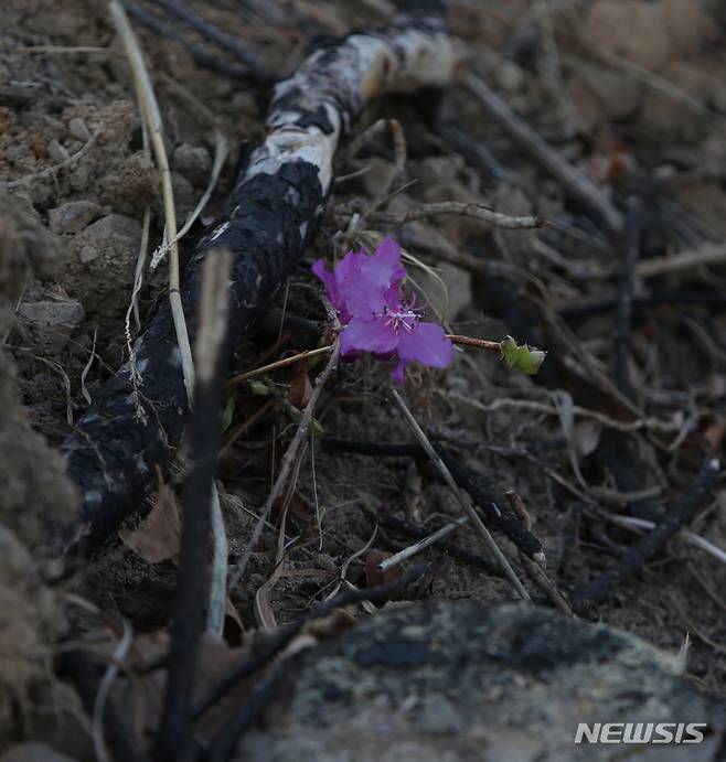 [동해=뉴시스] 김경목 기자 = 동해산불이 발생한 지 1년이 된 18일 오후 강원 동해시 오학산 산불 현장에서 검게 그을린 나무 밑동 사이로 분홍빛 진달래꽃이 피어 자연의 생명력을 실감케 한다. 2023.03.18. photo31@newsis.com