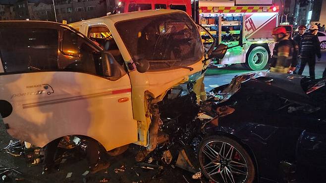 천안서 승용차가 보행자 · 오토바이 · 화물차 충돌…4명 병원 이송