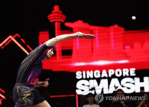 epa10529961 Ma Long of China in action against Hugo Calderano of Brazil during their Men?s singles semi-final match at the Singapore Smash 2023 Table Tennis Tournament in Singapore, 18 March 2023. EPA/HOW HWEE YOUNG