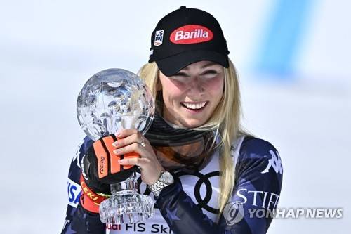 epa10529986 Women's Slalom World Cup winner Mikaela Shiffrin of the United States celebrates with her trophy at the FIS Alpine Skiing World Cup finals in the skiing resort of El Tarter, Andorra, 18 March 2023. EPA/JEAN-CHRISTOPHE BOTT