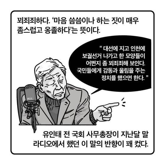 꾀죄죄하다. '마음 씀씀이나 하는 짓이 매우 좀스럽고 옹졸하다'는 뜻이다. 유인태 전 국회 사무총장이 지난달 말 라디오에서 했던 이 말의 반향이 꽤 컸다. 직설적 평론가인 그는 이재명 더불어민주당 대표에 대해 "억울하면 굳이 (체포동의안에) 목 맬 필요가 없다. 정치를 계속 하려면 좀 감동적인 모습이 있어야 되는데, 대선에 지고 인천에 보궐선거 나가고 한 모양들이 어쩐지 좀 꾀죄죄해 보인다. 국민들에게 감동과 울림을 주는 정치를 했으면 한다"고 했다. 또 "영장실질심사를 받아 구속되면 또 어떠냐. 그 정도 모험도 안 하고 자꾸 거저먹으려고 하면 안 된다"며 자신을 내던지는 큰 정치를 주문했다.