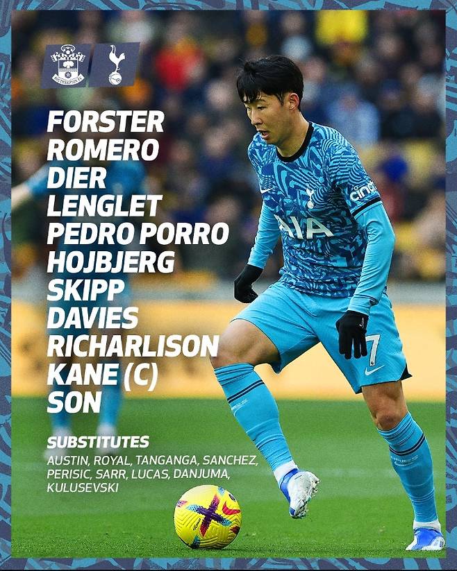 토트넘은 오는 19일(한국시간) 영국 세인트 메리즈 스타디움에서 열리는 사우샘프턴과의 2022/23시즌 프리미어리그 28라운드 맞대결을 앞두고 선발 명단을 발표했다.
