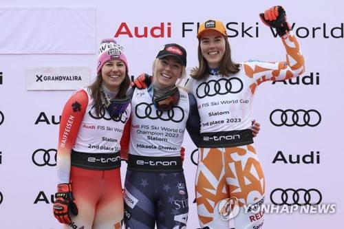 United States' Mikaela Shiffrin, center, winner of the alpine ski, women's World Cup slalom discipline, celebrates on the podium with second-placed Switzerland's Wendy Holdener, left, and third-placed Slovakia's Petra Vlhova, in Soldeu, Andorra, Saturday, March 18, 2023. (AP Photo/Alessandro Trovati)