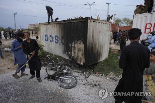 Supporters of former Prime Minister Imran Khan gather next to a burned motorbike and shipping container after clashes with police, in Islamabad, Pakistan, Saturday, March 18, 2023. Pakistani police stormed former Prime Minister Khan's residence in the eastern city of Lahore on Saturday and arrested 61 people amid tear gas and clashes between Khan's supporters and police, officials said. (AP Photo/Anjum Naveed)