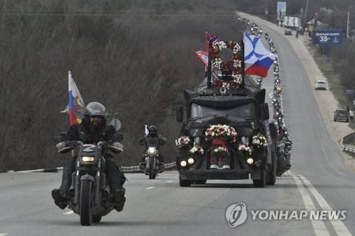 Russian biker group Nochniye Volki (the Night Wolves) drives with Russian national flags toward Sevastopol attending a motor rally marking the ninth anniversary of Crimea annexation from Ukraine, Crimea, Saturday, March 18, 2023. (AP Photo)