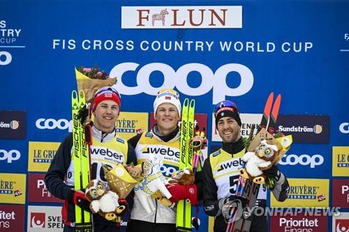 epa10530178 Winner Johannes Hoesflot Klaebo (C) of Norway, second placed Erik Valnes (L) of Norway and third placed Federico Pellegrino (R) of Italy celebrate on the podium after the final of the men's sprint free event of the FIS Cross Country Skiing World Cup in Falun, Sweden, 18 March 2023. EPA/Ulf Palm SWEDEN OUT