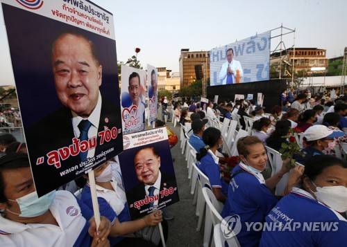 epa10530179 Supporters hold pictures (L) of Thai Deputy Prime Minister and Prime Minister candidate of the Palang Pracharath Party, Prawit Wongsuwan during the party's launch of candidacies and election campaign policies in Bangkok, Thailand, 18 March 2023. Prawit, leader of Thailand's army-backed ruling Palang Pracharath Party, announced to run as challenger of Prime Minister Prayut Chan-o-cha in the upcoming a general election expected to be held in May 2023 as the House of Representatives will end its four-year term on 23 March 2023. EPA/NARONG SANGNAK