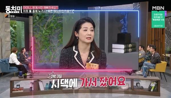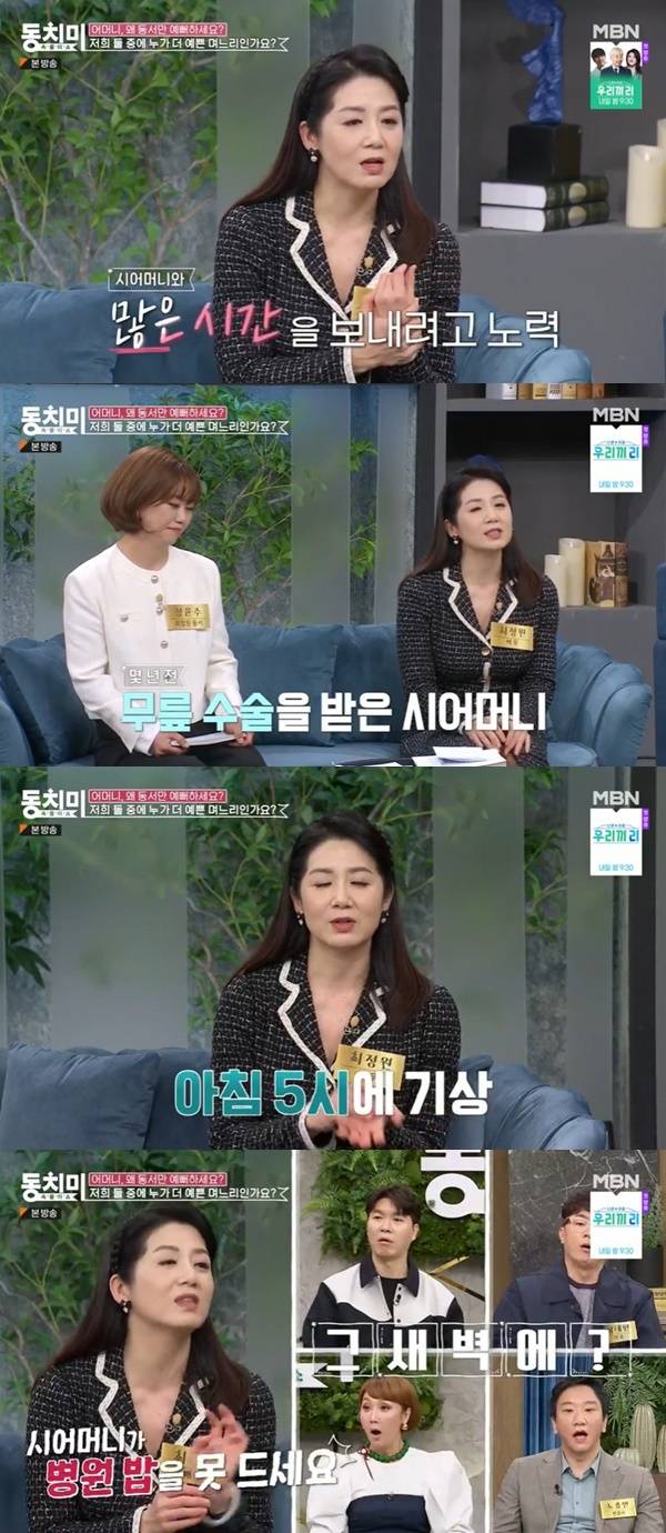 최정원은 “지금 임플란트 치료도 받으시는데 어머니가 겁이 많다. 주사도 못 맞을 정도다. 제가 모시고 다니고 있다. 동서도 잘하는데 제가 시간이 더 많아서 어머니를 살갑게 잘해드리니까 아무래도 어머니는 저를 조금 더 예뻐하시지 않을까 생각이 든다”고 말했다. (사진=MBN ‘속풀이쇼 동치미’ 캡처)