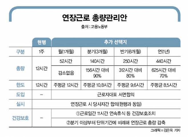 단위기간이 확대될수록 연장근로 총량은 줄어든다. 월 단위 연장근로시간(52시간)을 기준으로 분기는 156시간(52시간×3개월)의 90%인 140시간, 반기는 312시간의 80%인 250시간, 1년은 625시간의 70%인 440시간으로 제한된다. 연장 근로시간을 돈으로 보상받는 대신 저축했다가 향후 한 달 휴가 등 장기휴가로 쓸 수 있게 법제도를 정비하기로도 했다. 필요할 때 집중해서 일하고, 쉬고 싶을 때 더 자유롭게 쉴 수 있도록 한다는 구상이다.