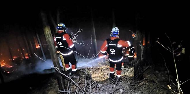 [서울=뉴시스] 조수정 기자 = 산림청 중앙산불방지대책본부는 18일 21시 20분께 전라남도 순천시 별량면 금치리 산 137 일원에서 발생한 산불을 12시간 10분만에 주불진화 완료했다고 밝혔다. (사진=산림청 제공) 2023.03.19.photo@newsis.com *재판매 및 DB 금지