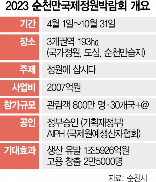 2023 순천만국제정원박람회는 ‘정원에 삽니다’를 주제로 순천만국가정원, 순천만습지, 순천도심 일원에서 4월 1일부터 10월 31일까지 열린다. 10년 전에는 순천만국가정원이라는 한정된 공간에서 개최됐지만 올해는 행사장을 대폭 확대해 역대 최고 수준의 풍성한 콘텐츠와 프로그램을 선보일 계획이다.