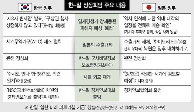 이도운 대통령실 대변인은 19일 브리핑에서 “이번 정상회담은 한-일 관계를 미래지향적으로 전환하는 중요한 출발점이 됐다는 평가가 한국, 일본, 국제사회에서도 공통되게 나온다”고 자평했다. 대통령실은 윤 대통령의 귀국 다음날인 18일에도 ‘방일 결과 설명 자료’를 내어 △양국 관계의 미래 지향점 확인 △경제안보와 미래첨단산업 등 전략적 협력 지평 확대 △수출규제 조치 철회 △셔틀 외교 재개 등을 강조했다. 같은 날 박진 외교부 장관과 김태효 국가안보실 1차장은 텔레비전에 출연해 윤 대통령 방일의 ‘성과’를 부각하려 애썼다.