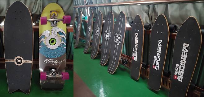 | ▲ 바다에 나가지 못하는 날 타는 랜드서핑 장비. 일반적인 스케이트 보드와 달리 바퀴의 재질과 크기가 다르다. |
