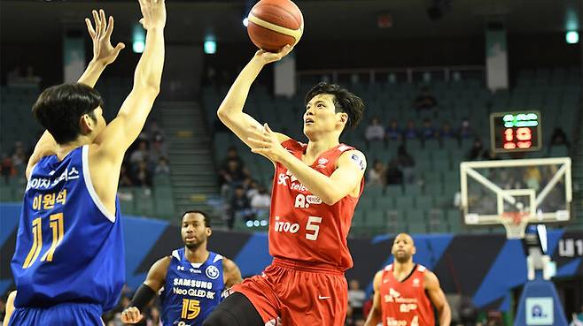 최하위인 삼성에서는 3점슛 4개 포함 22점을 넣은 이정현이 KBL 통산 8번째로 3점슛 1천개를 달성했습니다.