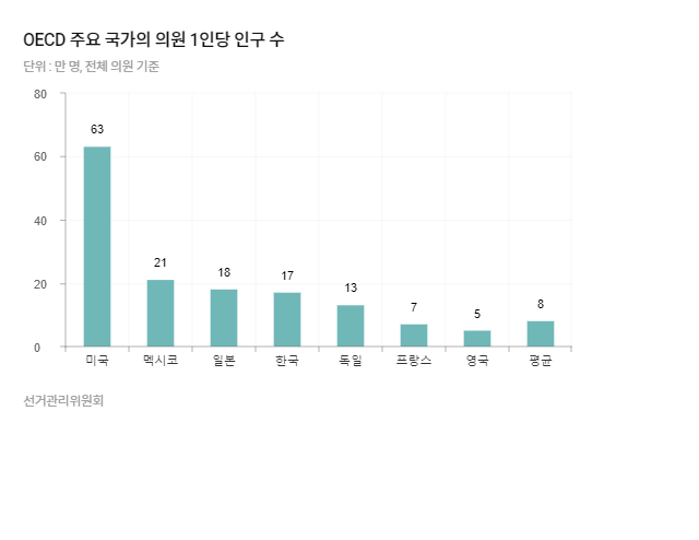 선거관리위원회의 ‘각국의 선거제도 비교연구’ 자료에 따르면, 한국은 지난해 기준 의원 1인당 인구수는 17만 명으로 경제협력개발기구(OECD) 36개국 중 의원 1인당 인구수가 네 번째로 많다.