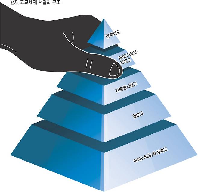 윤석열 정부의 고등학교 정책은 이 체계를 더욱 세분화하는 방식이다. 먼저 고교서열의 최정점에 있는 영재고가 2027년 광주·충북에 2곳 신설된다. 영재고 신설은 2016년 이후 11년 만이다. 상위권 문과생들이 선호하지만 최근 경쟁률이 하락 추세인 외고는 현 정부 들어서도 한때 폐지가 검토됐지만 논란 끝에 존치로 방향이 잡혔다. 고교서열 상위권 학교들의 배치 구조가 바뀌지 않거나 오히려 서열 상위권 학교가 늘어나는 것이다.