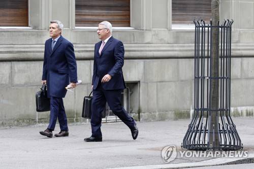 epa10531744 Vice Chairman of the Board of Directors UBS Group AG Lukas Gaehwiler (L) and Member of the Group Executive Board of UBS Group AG Markus Ronner (R) walk in front of the Bernerhof, headquarters of the Swiss Federal Department of Finance FDF, in Bern, Switzerland, 19 March 2023. The Federal Council, the Swiss National Bank and representatives of banks meet at the Bernerhof to negotiate the rescue of Credit Suisse or a possible merger with UBS. EPA/PETER KLAUNZER