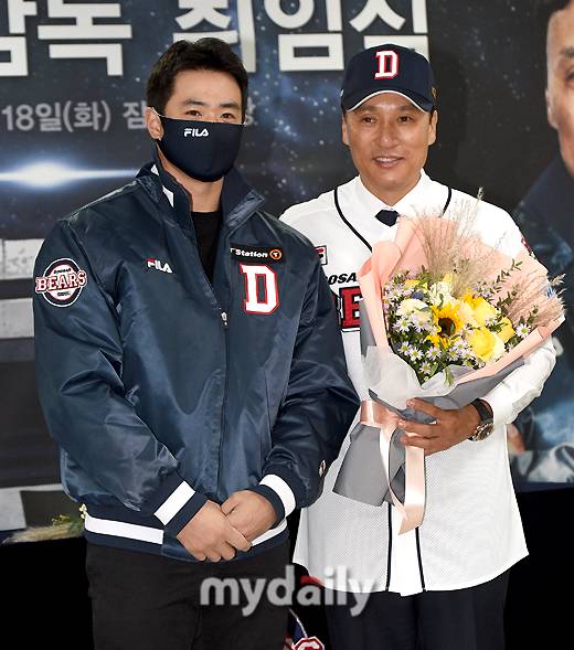 [김재환(위), 이승엽 감독과 김재환(아래). 사진 = 마이데일리 사진 DB]- ⓒ마이데일리(www.mydaily.co.kr). 무단전재&재배포 금지 -