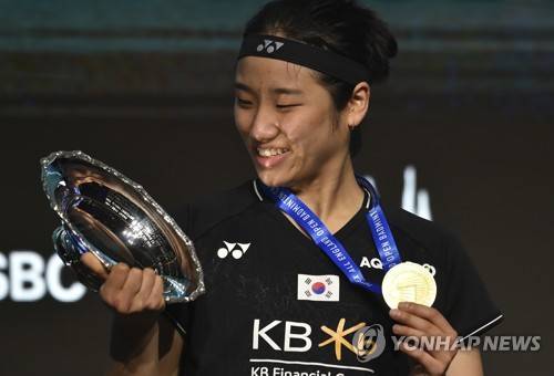 Korea's An Se Young poses with trophy after winning the women's final match against China's Chen Yu Fei in the All England Open Badminton Championships at the Utilita Arena in Birmingham, England, Sunday, March 19, 2023. (AP Photo/Rui Vieira)
