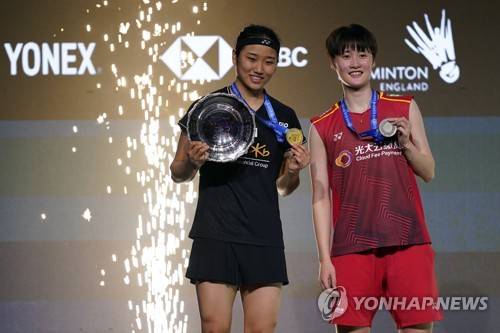 epa10532013 Number 2 seed An Se Young (left) from Korea celebrates victory against Number 4 seed Chen Yu Fei from China (right) during the Women?s Final of the All England Open Badminton Championships in Birmingham, Britain, 19 March 2023. EPA/Tim Keeton