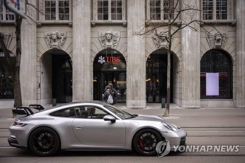epa10532073 A sportscar drives past the headquarters of Swiss banks Credit UBS in Zurich, Switzerland, 19 March 2023 morning. Shares of Credit Suisse lost more than one-quarter of their value on 15 March 2023, hitting a record low after its biggest shareholder, the Saudi National Bank, told outlets that it would not inject more money into the ailing Swiss bank. Its shares recovered briefly on 16 March after Switzerland's central bank announced that it was to loan CS money but fears of turmoil in the global banking sector persist. EPA/MICHAEL BUHOLZER