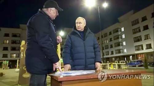 In this photo taken from video released by Russian Presidential Press Office on Sunday, March 19, 2023, Russian President Vladimir Putin, right, listens to Russian Deputy Prime Minister Marat Khusnullin at a newly built neighborhood during their visit to Mariupol in Russian-controlled Donetsk region, Ukraine. Putin has traveled to Crimea to mark the ninth anniversary of the Black Sea peninsula's annexation from Ukraine. (Russian Presidential Press Office via AP) AP PROVIDES ACCESS TO THIS PUBLICLY DISTRIBUTED HANDOUT PHOTO PROVIDED BY RUSSIAN PRESIDENTIAL PRESS OFFICE ; MANDATORY CREDIT.