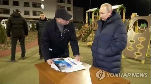 In this photo taken from video released by Russian Presidential Press Office on Sunday, March 19, 2023, Russian President Vladimir Putin, right, listens to Russian Deputy Prime Minister Marat Khusnullin at a newly built neighborhood during their visit to Mariupol in Russian-controlled Donetsk region, Ukraine. Putin has traveled to Crimea to mark the ninth anniversary of the Black Sea peninsula's annexation from Ukraine. (Russian Presidential Press Office via AP) AP PROVIDES ACCESS TO THIS PUBLICLY DISTRIBUTED HANDOUT PHOTO PROVIDED BY RUSSIAN PRESIDENTIAL PRESS OFFICE ; MANDATORY CREDIT.