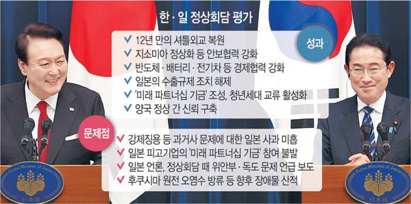 정상회담에서 일본 측이 정식 의제가 아니었던 위안부·독도 문제를 일방적으로 언급했을 가능성은 배제할 수 없다는 분석도 있다. 일본 측이 4월 선거용으로 위안부 합의 이행 등을 계속 거론할 경우 윤 대통령이 궁지에 몰릴 수 있다는 관측도 나온다.