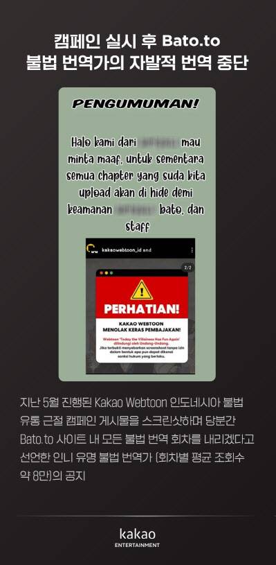 그 결과 인니 대형 불법 번역 그룹 운영자가 “카카오웹툰 번역을 중단하겠다”고 선언하는 등 다수의 불법 번역 사이트가 백기를 들었다.