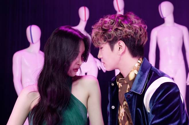 사진 속 선미는 비오의 목을 감싸고, 비오는 선미를 지그시 바라보고 있다. 그런 두 사람의 주변으로 마네킹이 줄지어 서있다.