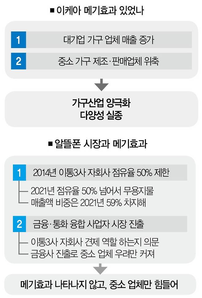 오롯이 대기업의 관점에서 보면, 이 기사의 논지는 틀리지 않았다. 한샘·리바트 등 대형 가구업체의 매출은 이케아 진출 이후 훨씬 더 성장했다. 하지만 시선을 중소 가구업체로 돌리면, 정반대의 결과가 보인다. 이케아에 맞서던 대형 가구업체들이 소가구·생활용품시장까지 치고들어오면서 중소 가구업계는 설자리를 잃었다. 이케아란 메기가 시장에 활력을 불어넣기는커녕 '파괴 본능'을 발휘한 셈이다.