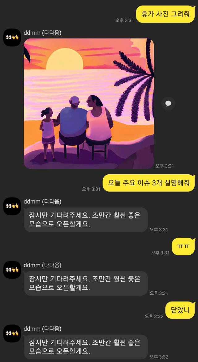 카카오(035720)브레인은 카카오톡으로 이용 가능한 인공지능(AI) 챗봇 '다다음'(ddmm) 프로젝트 베타 테스트가 일시 중단됐다고 20일 밝혔다. 이용자가 폭증하며 서비스가 불안정해지자 재정비에 나선 것으로 보인다.