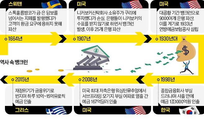 한국에서는 외환위기 때인 1998년 1월 초 사흘 만에 종합금융회사 예금 1조1000억원이 빠져나갔다. 당시 종금사 개인 예금의 38% 규모였다. 이후 금융 구조조정 과정에서 종금사라는 업태 자체가 사라졌다. 2011년 2월엔 부실 저축은행이 무더기 영업정지를 당하면서 전국 저축은행에서 하루 수천억원의 예금이 인출됐다.
